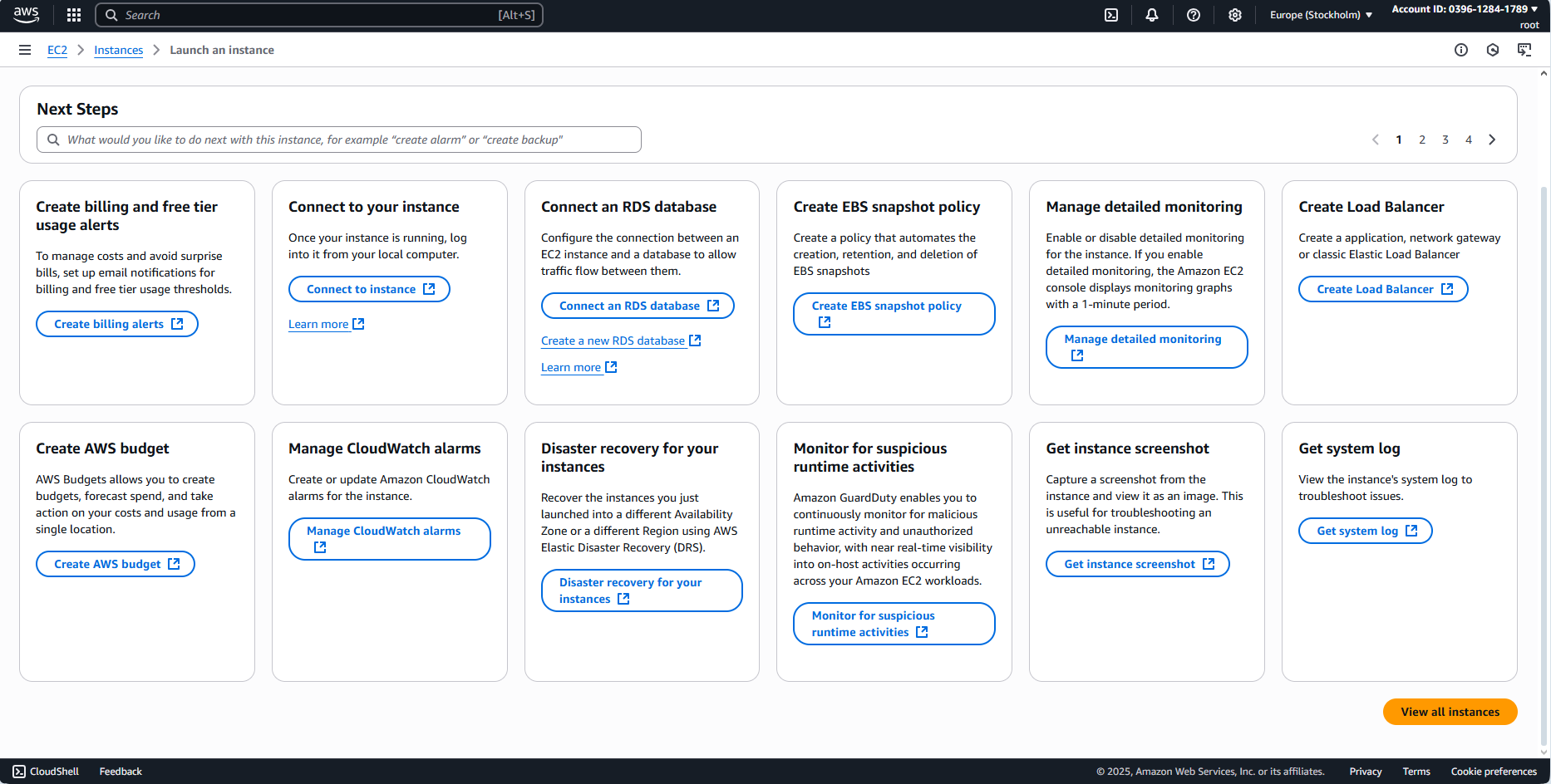 Once your instance is successfully created, you'll be directed to a this next screen. Scroll to the button of the page, and click on "View all instances".