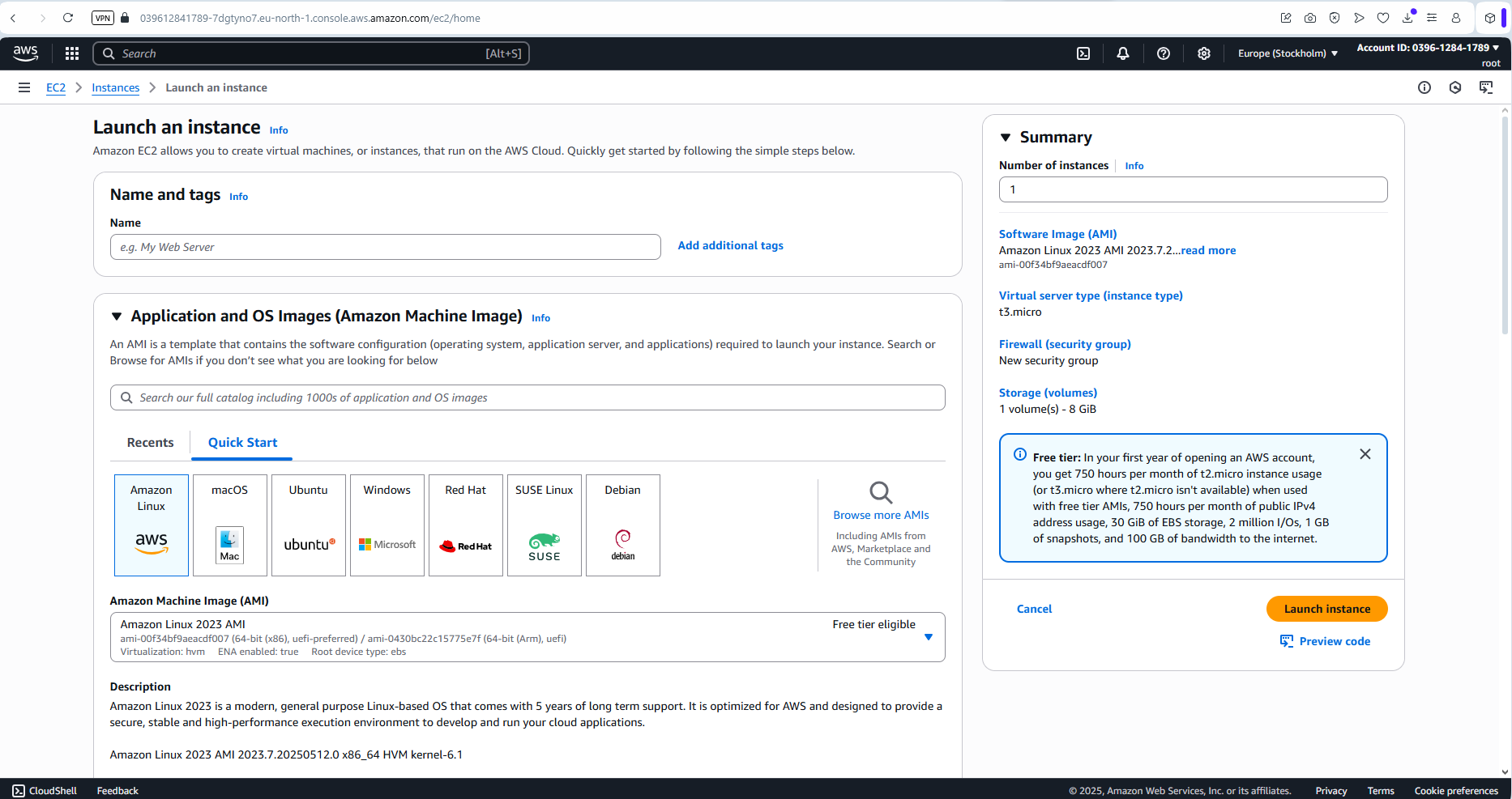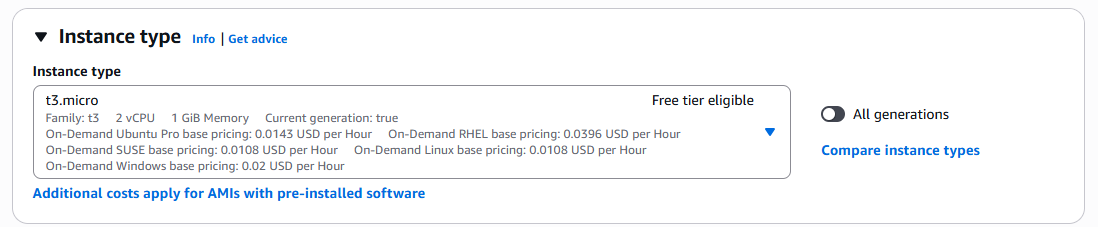 For this tutorial, I'll go with the free-tier t3-micro instance type.