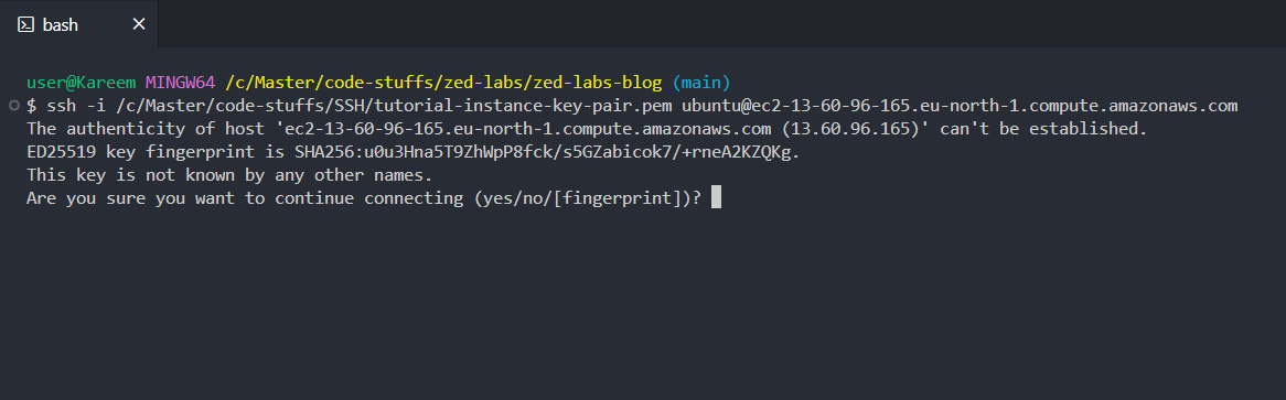 1ssh -i /c/directory-name/another-directory-name/SSH/tutorial-instance-key-pair.pem ubuntu@ec2-13-60-96-165.eu-north-1.compute.amazonaws.comThis Zed Labs Blog Article on how public key SSH authentication actually works, is an awesome resource that explains what the above command is all about, and how it works under the hood.