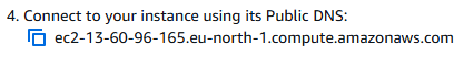 1ssh -i <path to SSH key-pair> ubuntu@<public IP or Public DNS of the instance>The public DNS can be found on the fourth todo of the current("SSH Client") option screen.