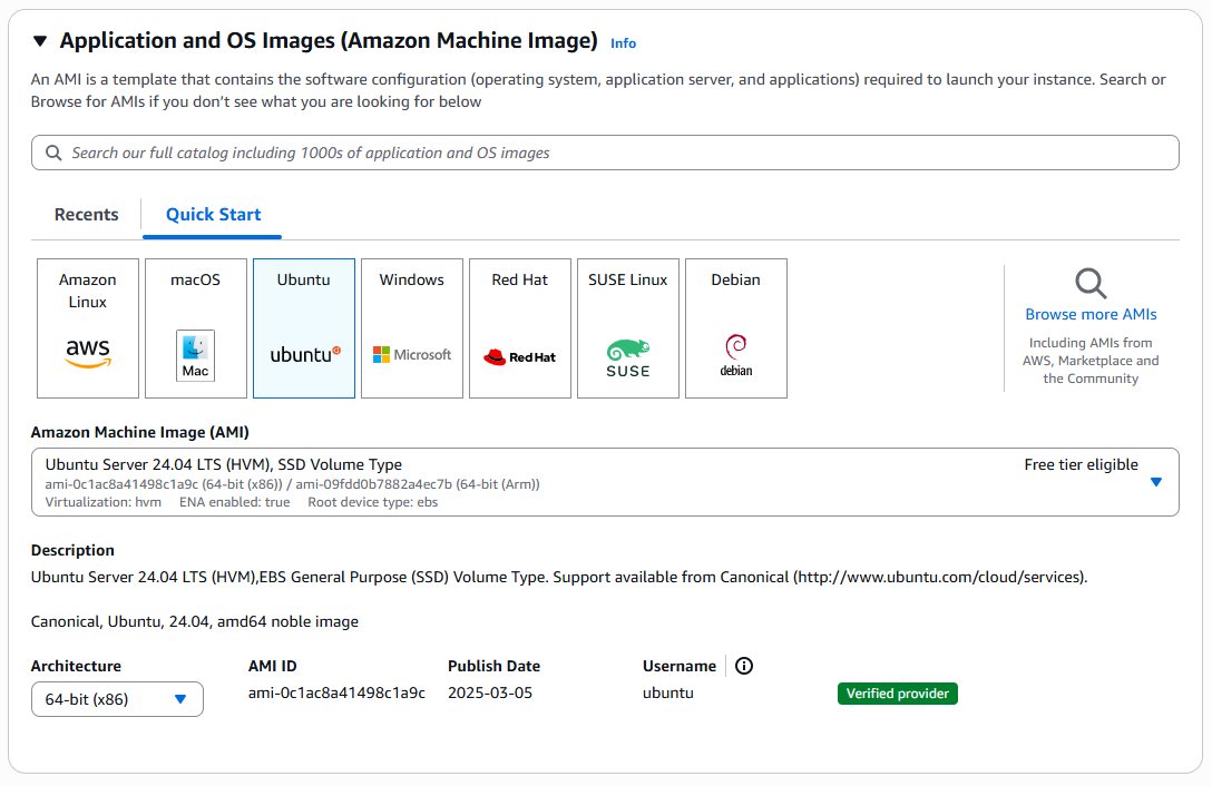 - Amazon Machine Image (AMI): Select the latest Ubuntu AMI that is free-tier eligible from the list.