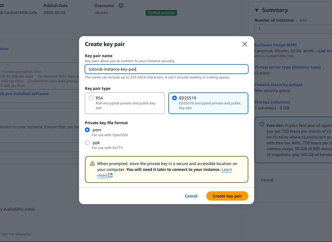 The key-pair("tutorial-instance-key-pair.pem" in my case) will be created, and will be downloaded to my computer.