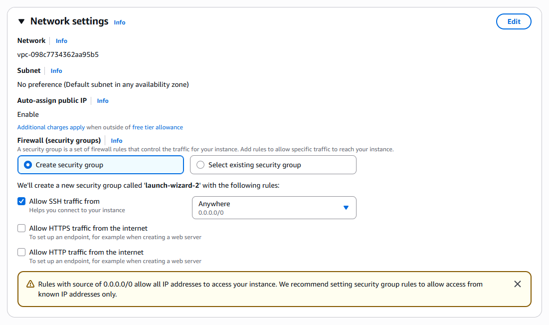 For the network settings, we'll leave everything as it is by default. We'll learn more about some or all of the default selections(security groups, VPC, Subnets, and more) in subsequent Zed Labs blog articles.