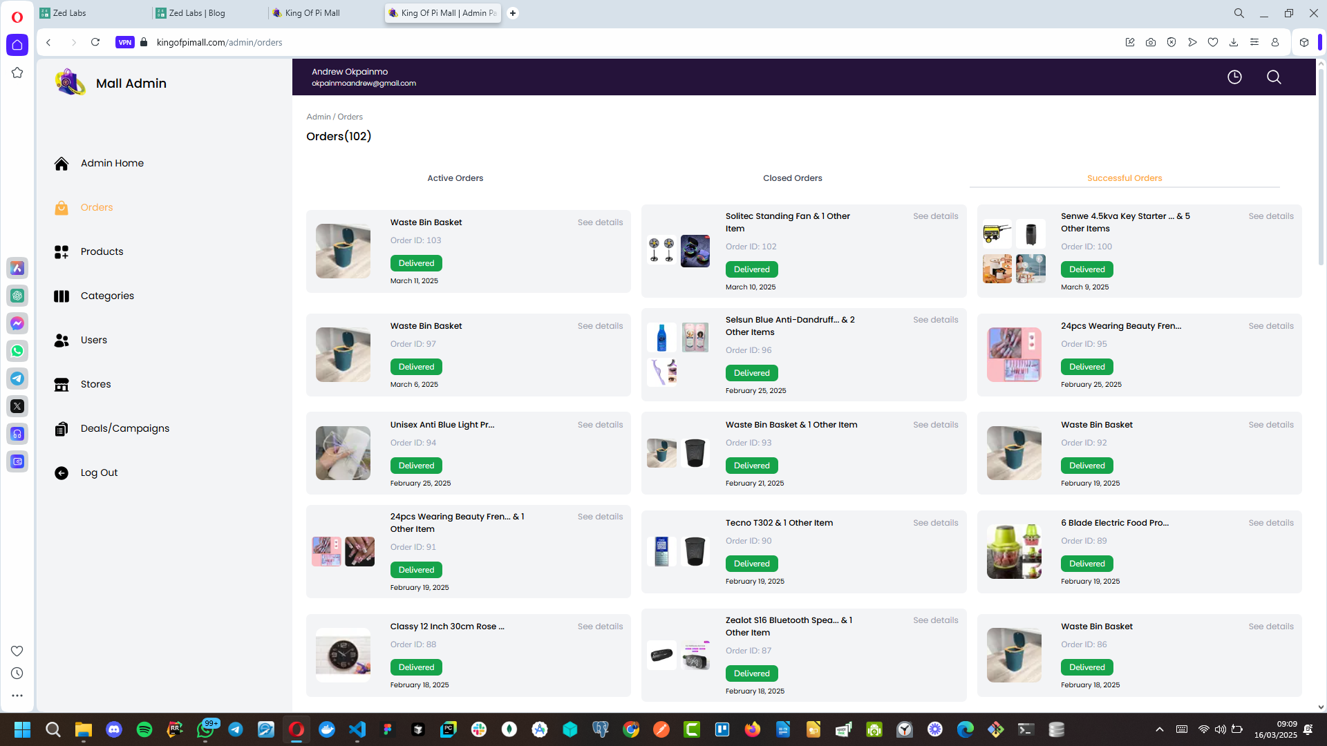 Image: a screenshot of the orders home screen on the admin section