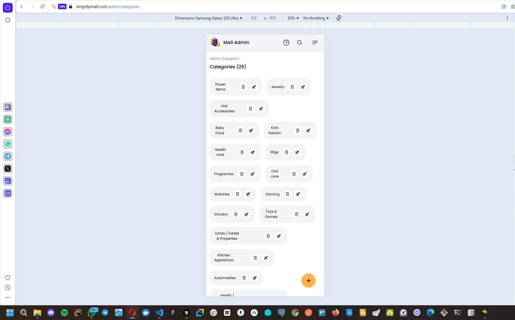 Image: a screenshot of the category management home screen on the admin section - showing mobile screen responsiveness